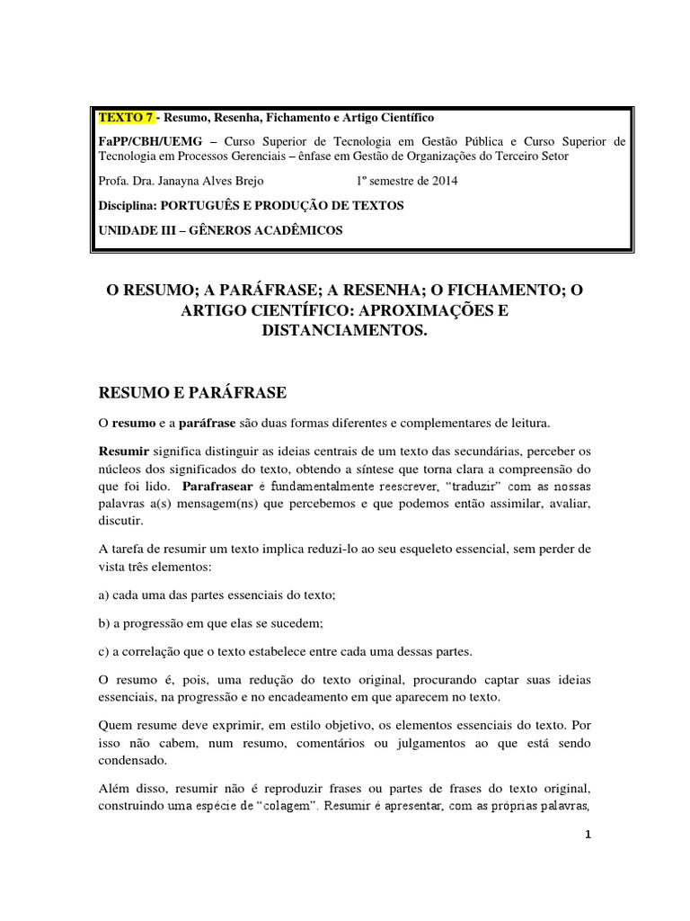 Texto 7 Resumo Resenha Fichamento E Artigo Cientifico Citacao