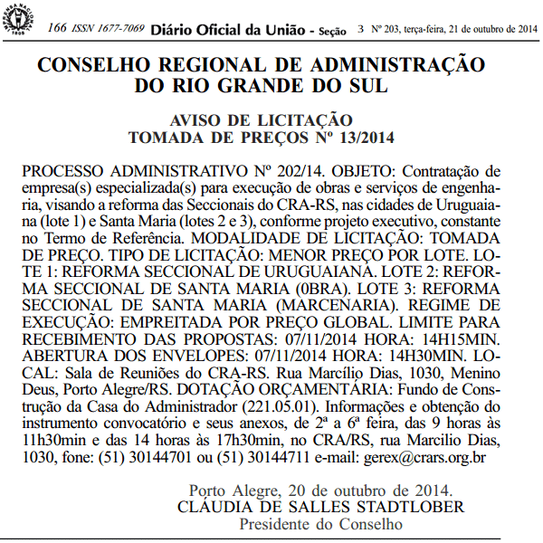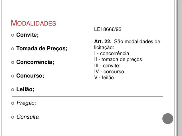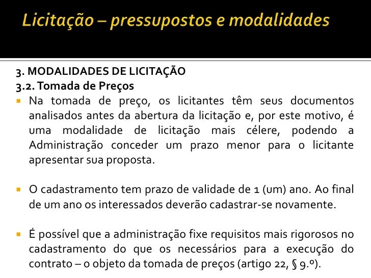 Certificado de regularidade com fgts certidão negativa de débitos com a previdência social e as certidões da fazenda municipal estadual e federal. O que diferencia a tomada de preços das outras modalidades essencialmente diz respeito à necessidade de cadastramento prévio dos interessados bem como do valor compras e serviços de até r65000000 e obras e serviços de engenharia até r150000000 e prazos de publicidade do edital artigos 22 e 23 da lei federal nº 866693.