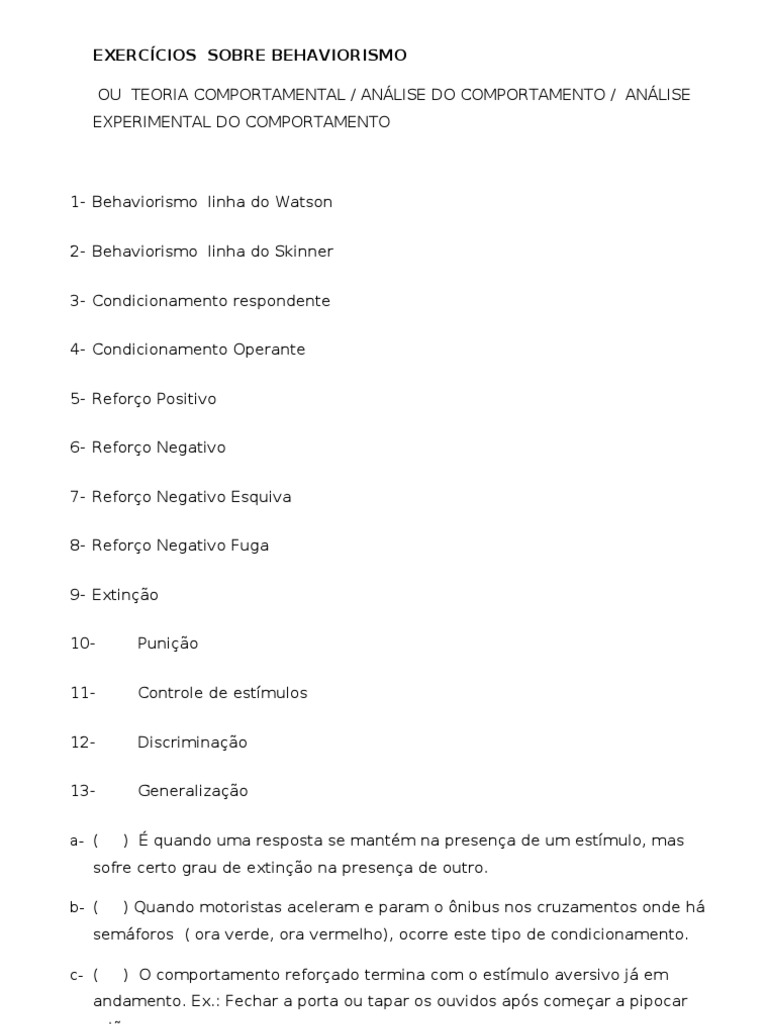Exercicios Sobre Behaviorismo Behaviorismo Reforco