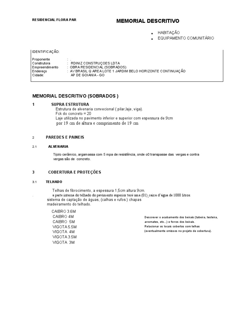Completo com dados Exemplo De Memorial Descritivo De Obra Residencial.