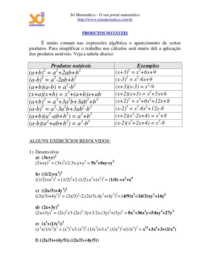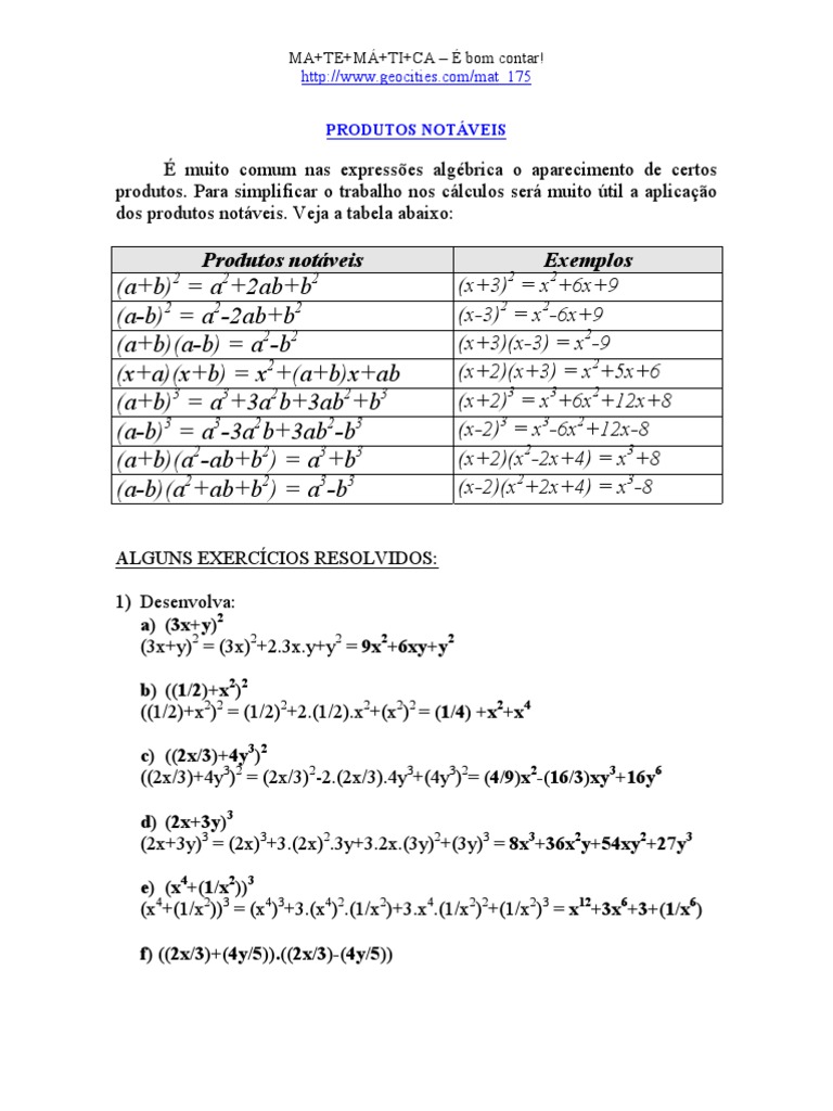 Matematica Exercicios Resolvidos Produtos Notaveis