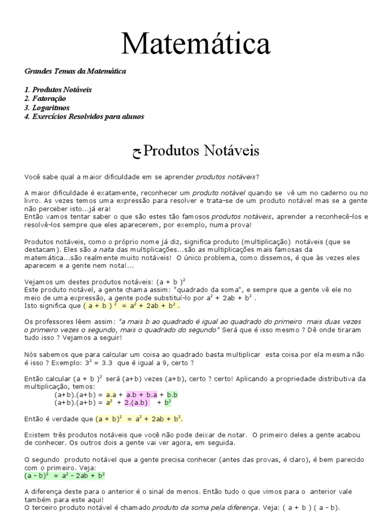 Matematica Produtos Notaveis E Fatoracao Logaritmo