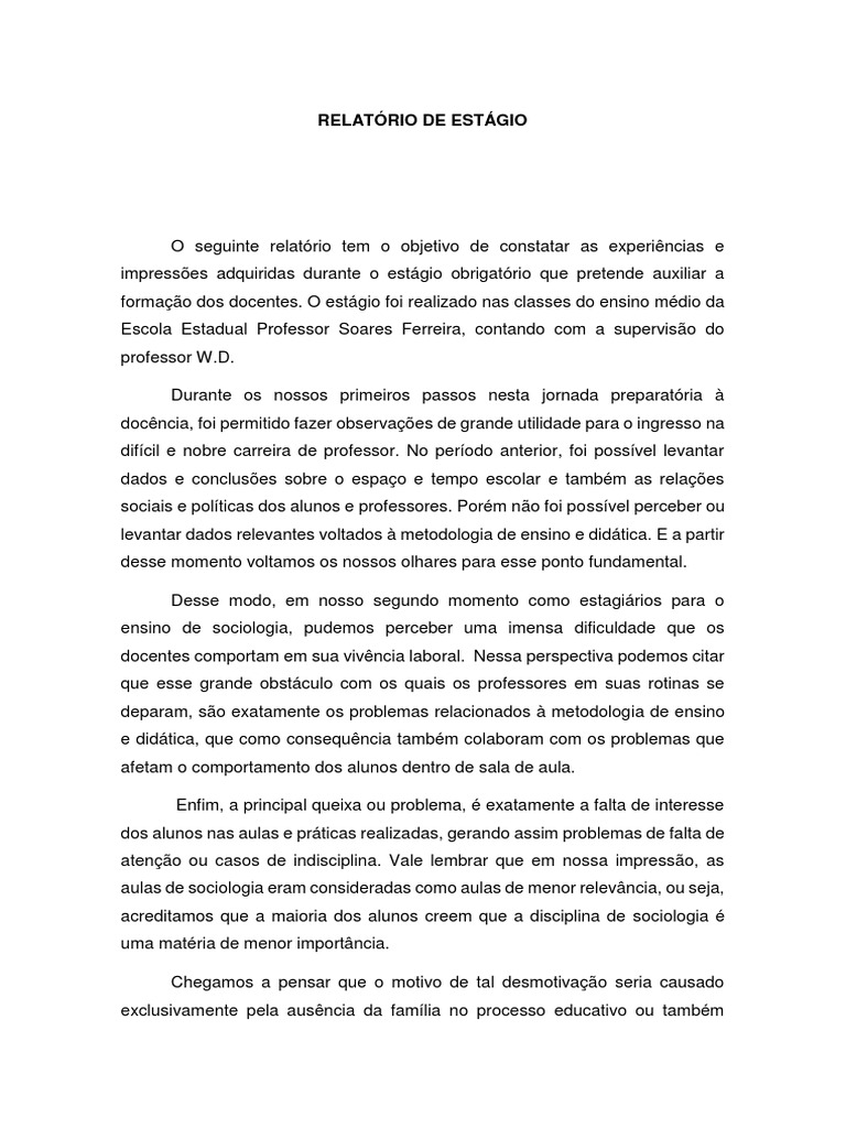 Estagio Relatorio Sociologia Sociologia Pedagogia