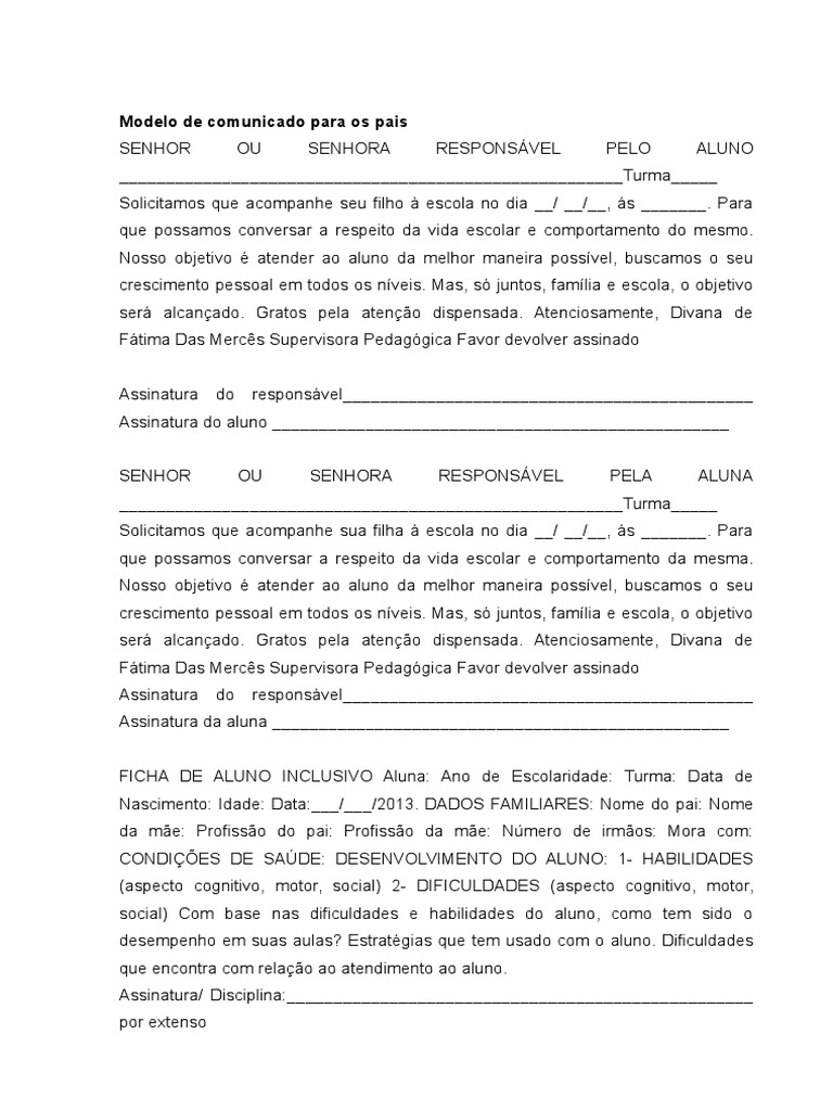 Modelo De Comunicado Para Os Pais Docx Licao Escolas