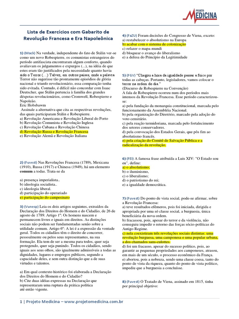 Questoes De Vestibular Sobre A Era Napoleonica E O Congresso De