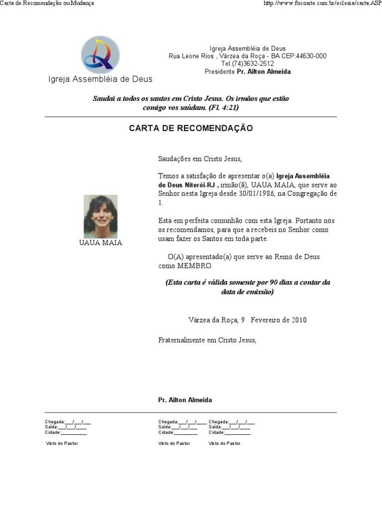 Carta Padrao Para Recomendacao Mudanca Ou Em Transito Para Igreja