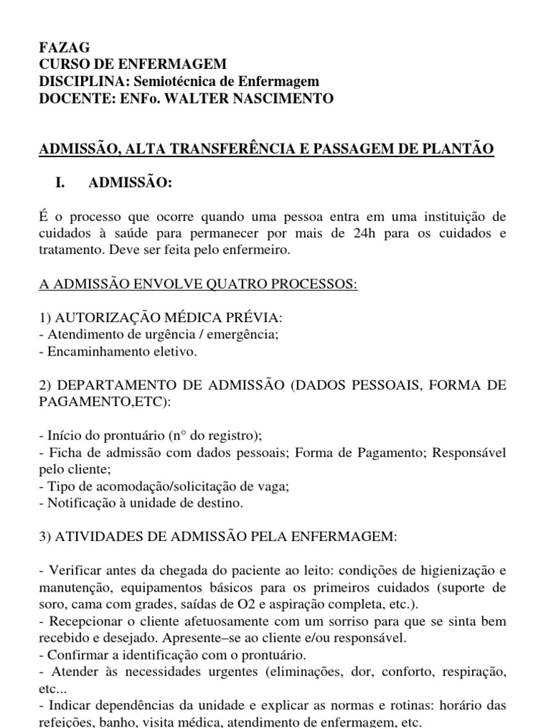Admissao Do Paciente Aula De Valten Enfermagem Unidade De