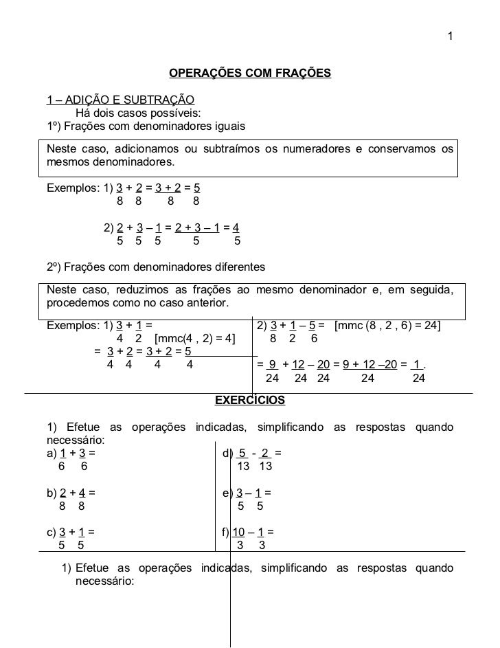 Exercicios De Operacoes Com Fracoes Adicao Subtracao E