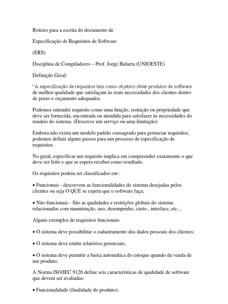 Roteiro Para Especificacao De Requisitos De Software Docx Caso
