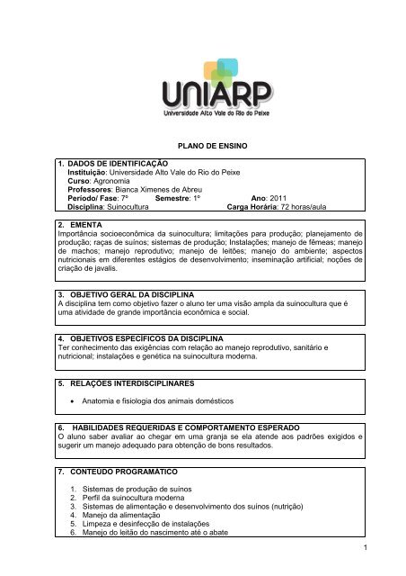 Modelo De Plano De Ensino Agronomia Suinocultura Uniarp