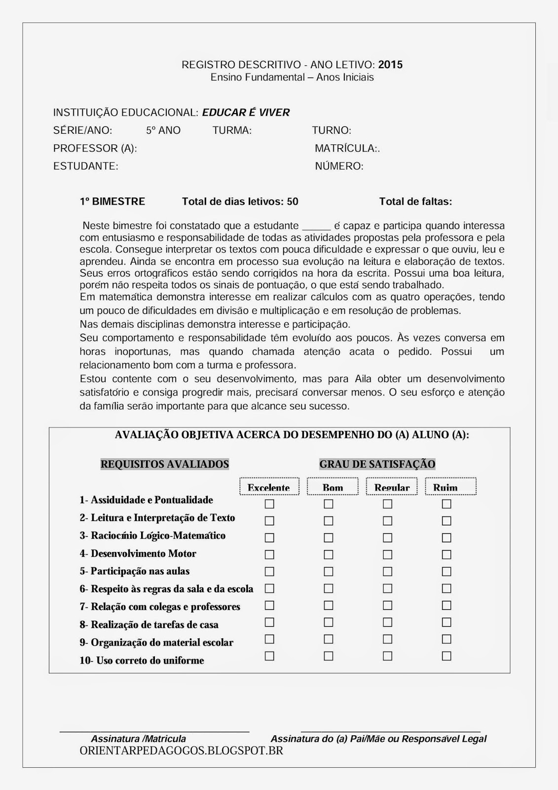 Modelo de relatório de avaliação da turma coloque o ano e a série por exemplo.