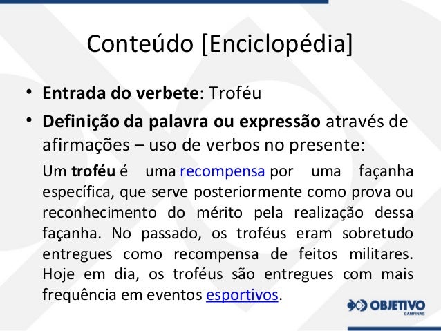 O texto enciclopédico é redigido por verbetes que consistem na apresentação de um assunto de forma sucinta e direta como em dicionarios de lingua portuguesa.