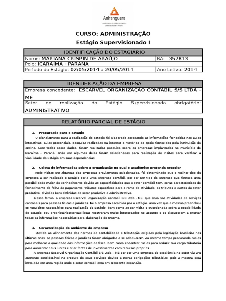 Coleção de administradores sobre Exemplo De Relatorio De Estagio Supervisionado Anhanguera.