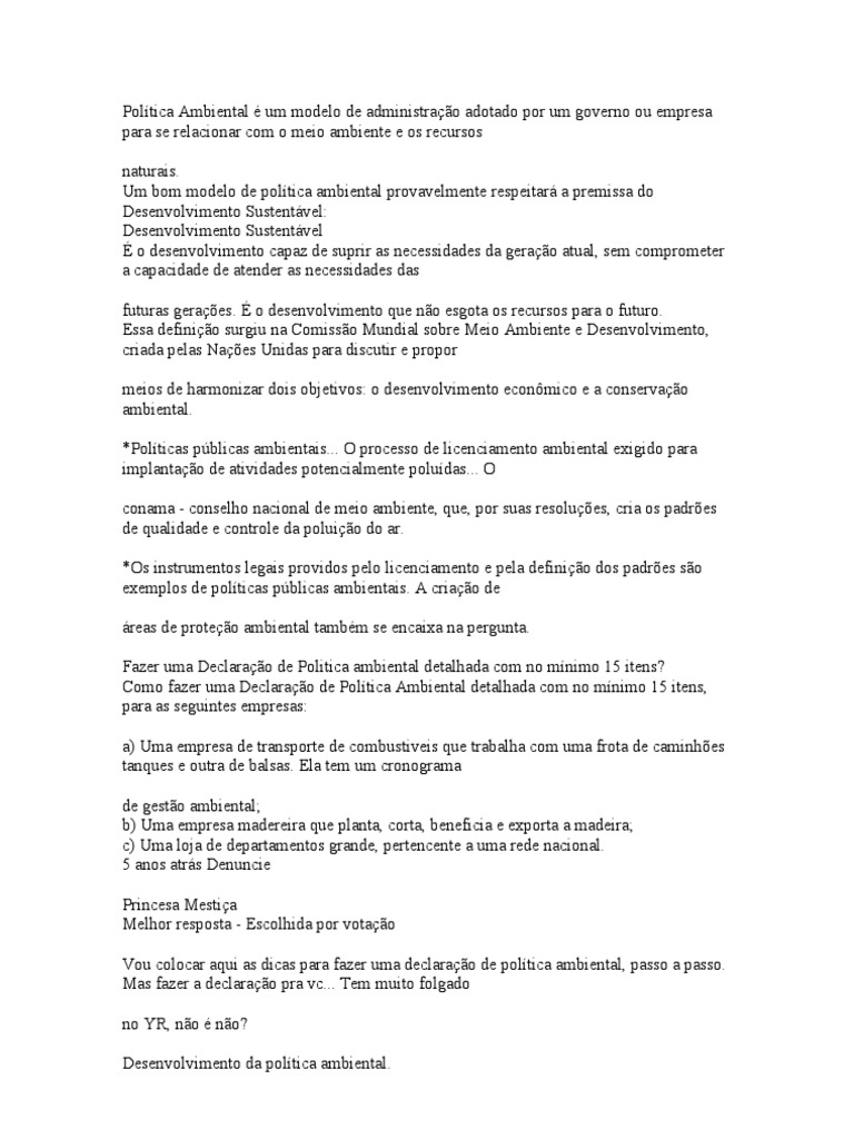 Dados sobre Exemplo De Politica Ambiental De Uma Empresa.