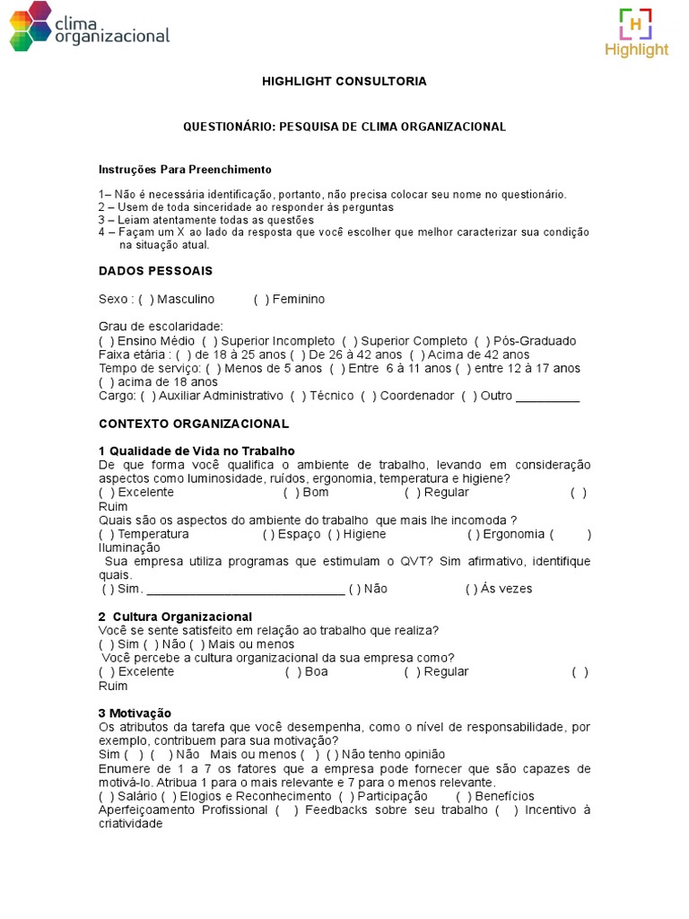 Questionario Padrao Pesquisa De Clima Organizacional Motivacao