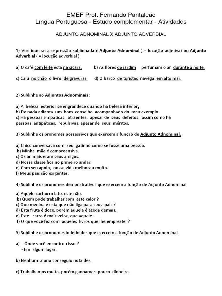 Adjunto Adnominal Exemplos E Exercicios Resolvidos