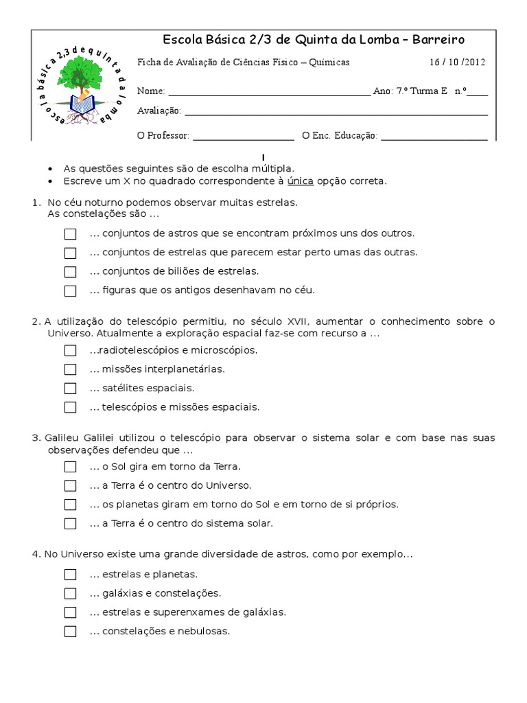 7 Ano Teste Astronomia Sistema Solar Planetas