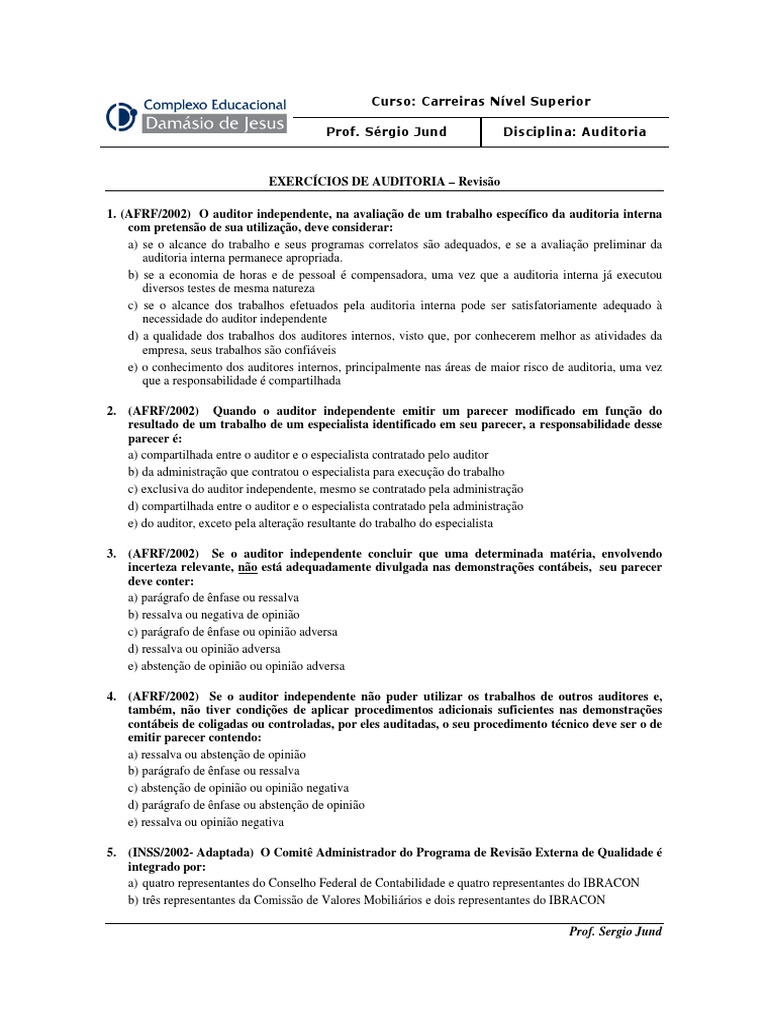 Questoes Sobre Parecer De Auditoria E Opiniao Do Auditor