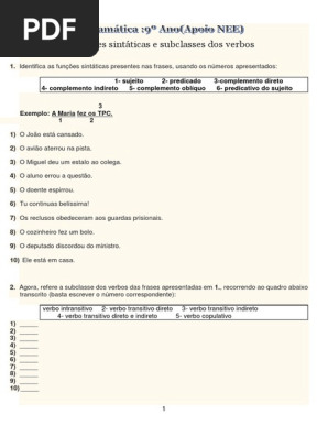 Gramatica Subclasses Do Verbo 9ºano Apoio Assunto Gramatica