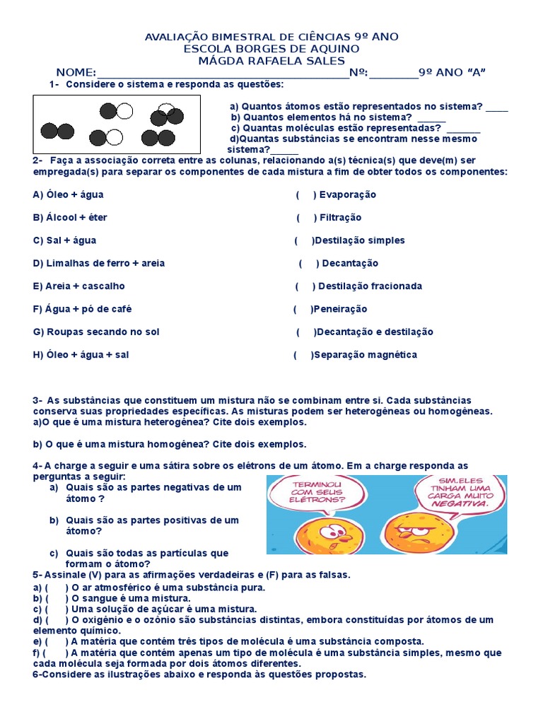 Avaliacao Bimestral De Ciencias 9º Ano Substancias Quimicas