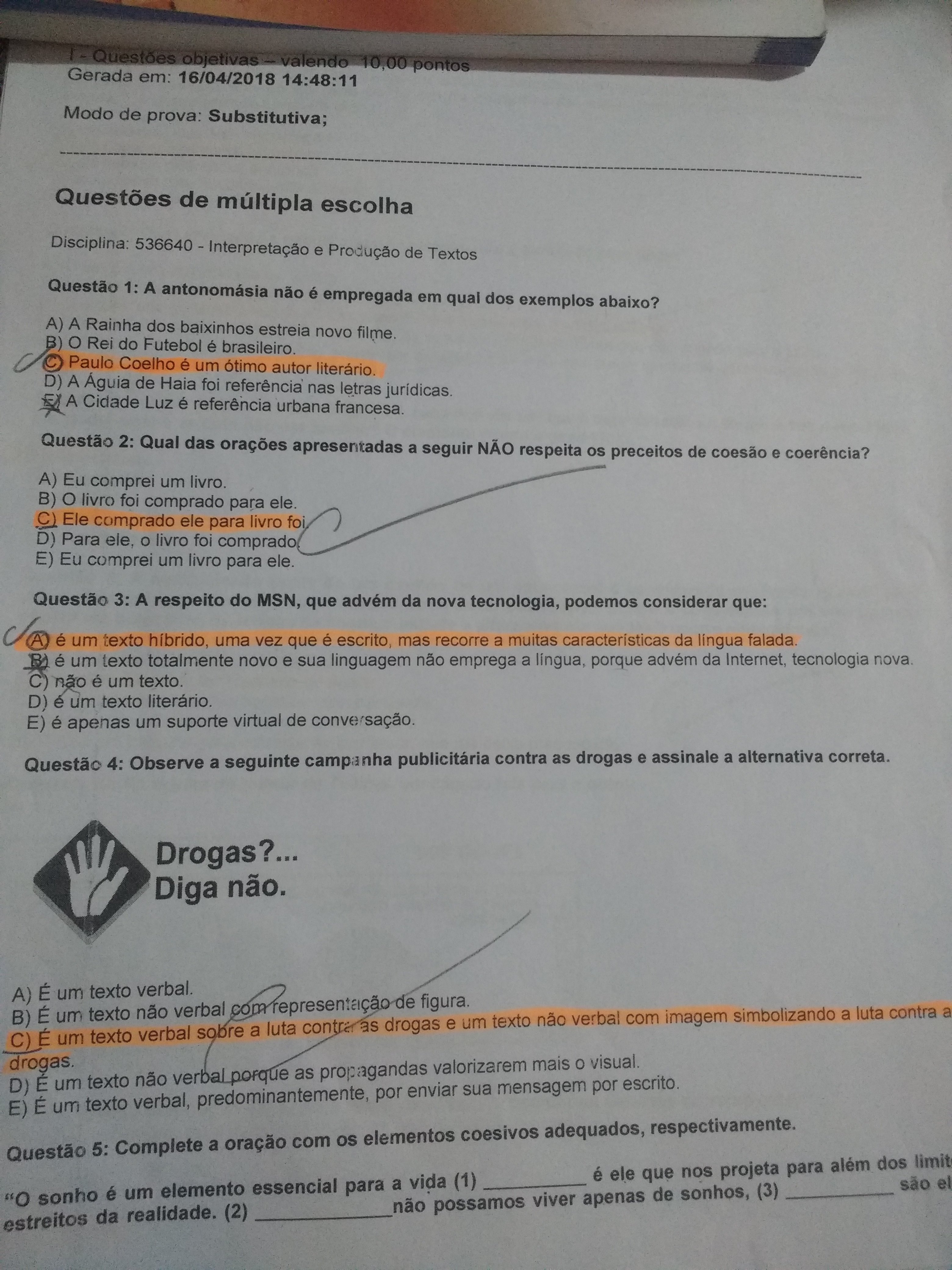 Pergunta 10 1 em 1 pontos qual das orações apresentadas a seguir não respeita os preceitos de coesão e coerência.