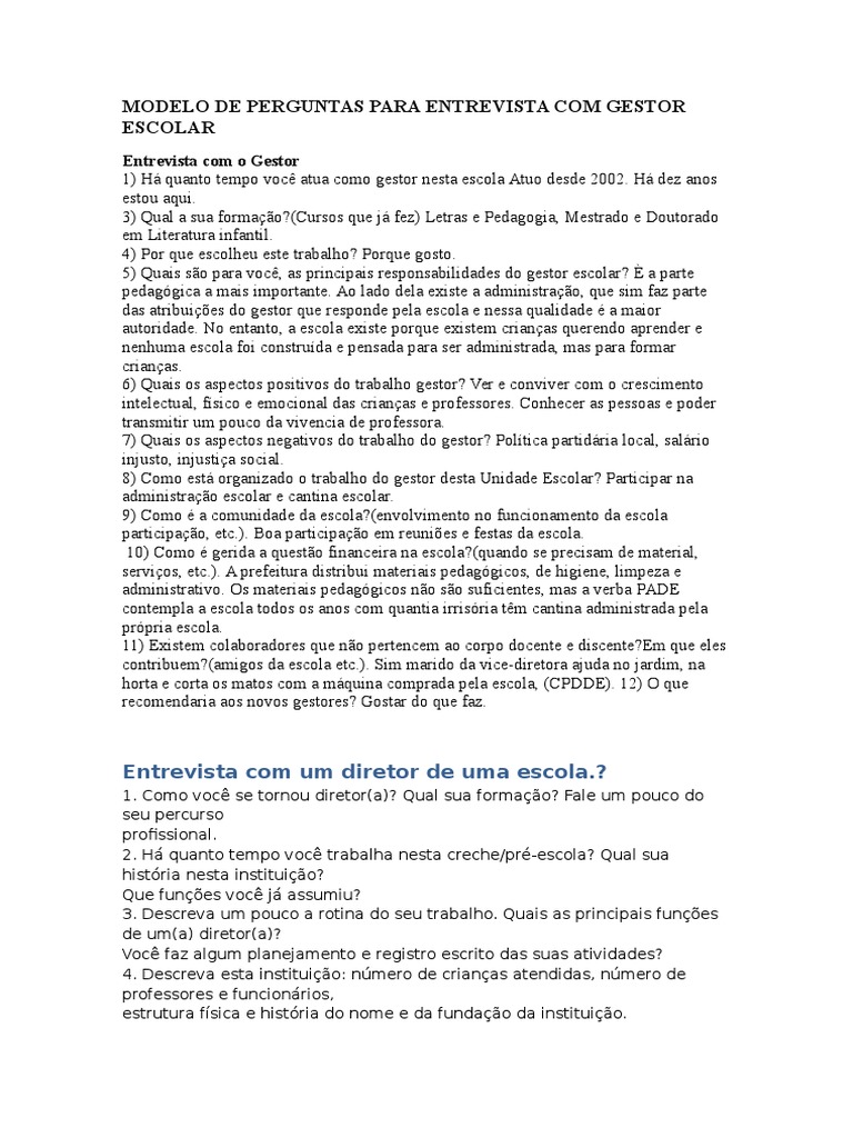 Modelo De Perguntas Para Entrevista Com Gestor Escolar Escolas