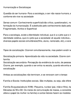 Humanizacao E Socializacao Sociologia Mackenzie Studocu