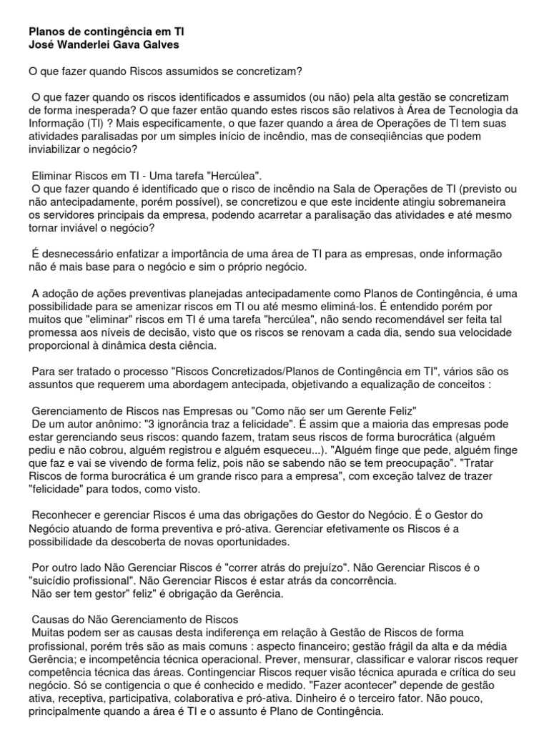 Plano De Contingencia Tecnologia Da Informacao Risco