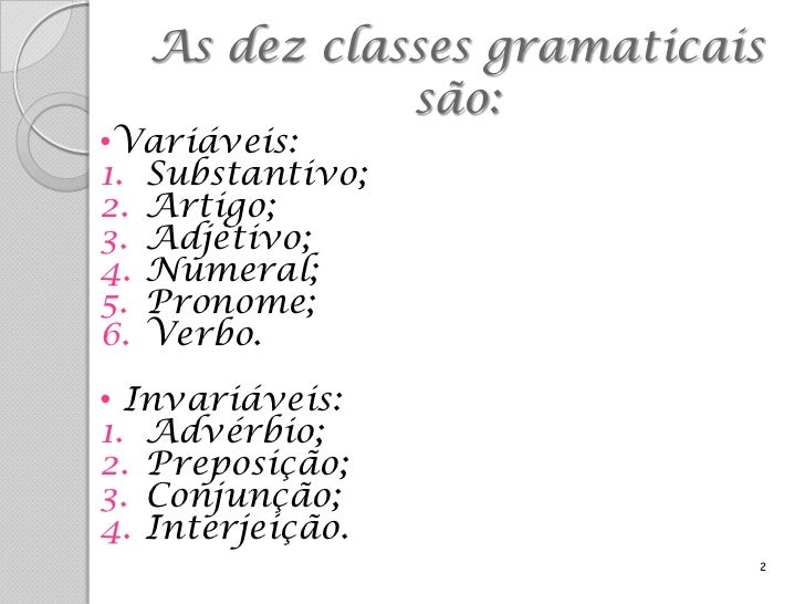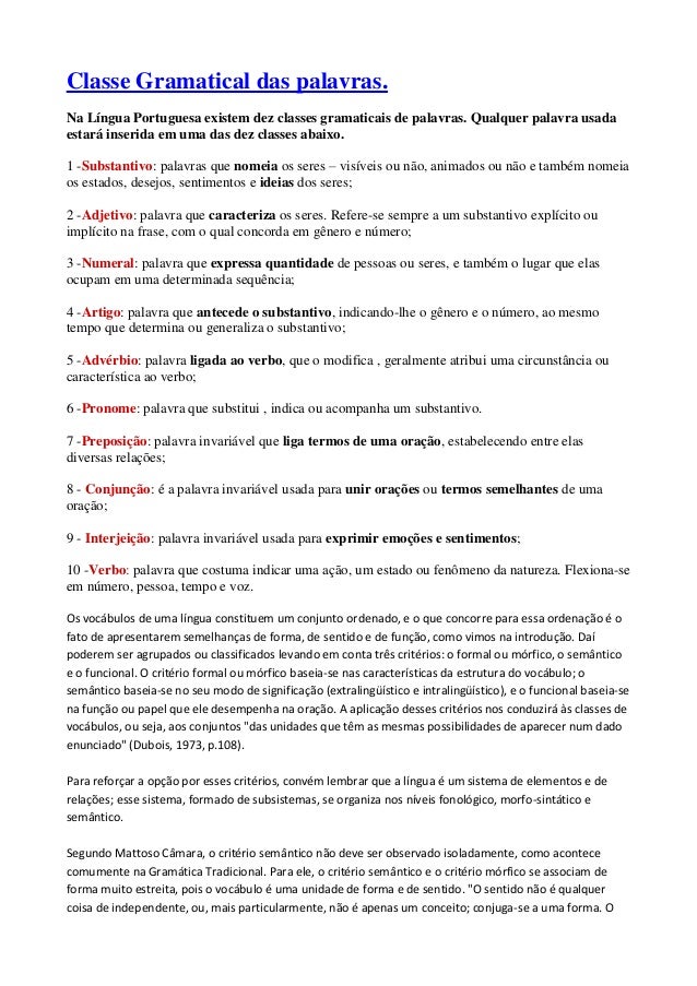 Contabilizando um conjunto de dez classes gramaticais classes de palavrasesta classificação possui um critério de composição denominado para alguns gramáticos de critério morfo semântico.