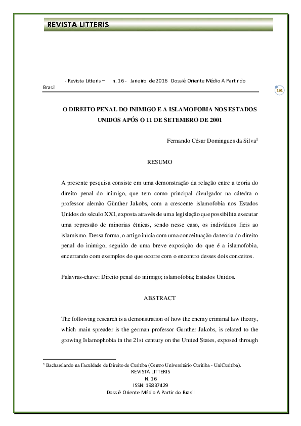 Pdf O Direito Penal Do Inimigo E A Islamofobia Nos Estados Unidos