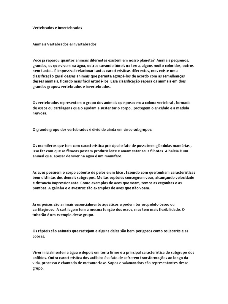 Completo com dados Exemplo De Animais Vertebrados E Invertebrados.