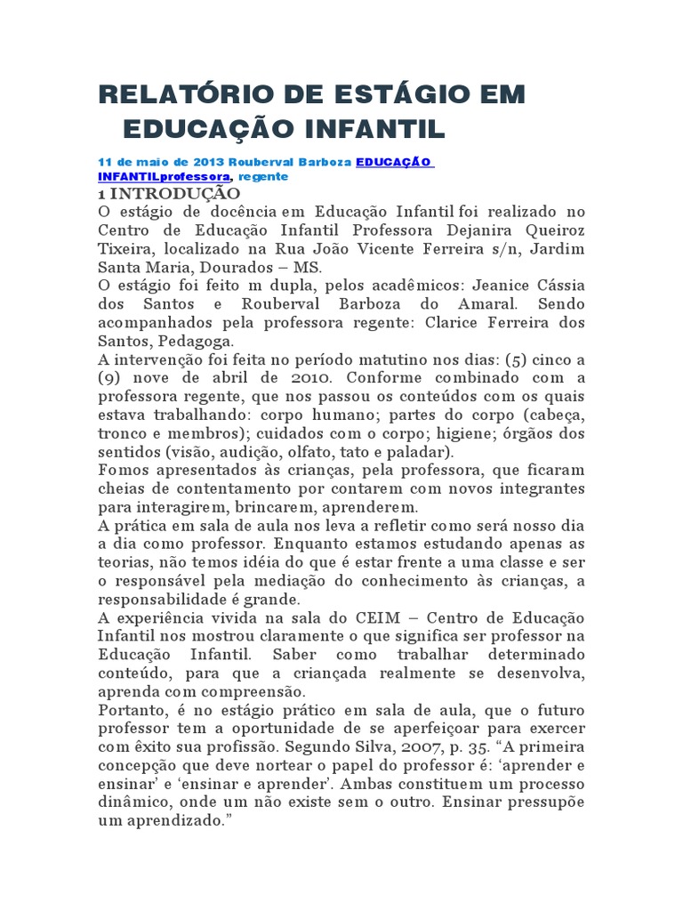 Exemplo De Relatorio De Estagio Em Educacao Infantil Licao