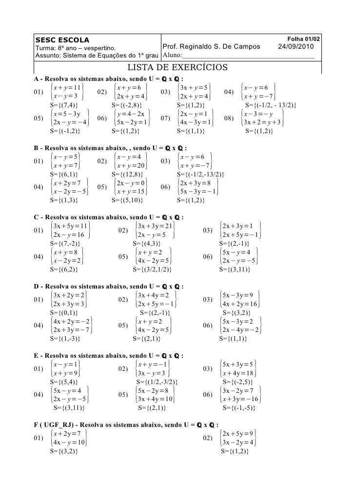 Lista De Exercicios Sistema De Equacoes Do 1 Grau