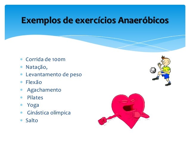 Exemplos de atividades anaeróbias são o levantamento de peso as artes marciais corrida lançamentos e saltos atléticos o tênis etc em todo treinamento você terá que combinar os 2 sistemas exercício aeróbico e anaeróbico pra que teu plano seja completo e apto de fazer qualquer atividade evitando o rápido aparecimento de.