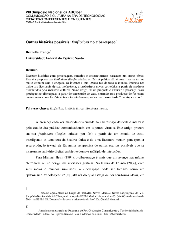 Pdf Outras Historias Possiveis Fanfictions No Ciberespaco