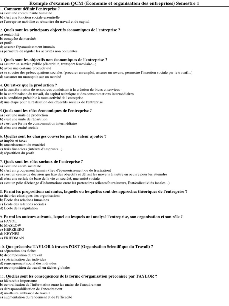 Exemple Examen Qcm Eco Org D Entraprise S1 Pdf Business