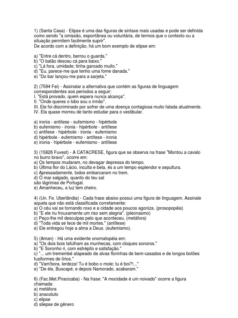 Exercicios Com Gabarito De Portugues Figuras De Linguagem Docsity