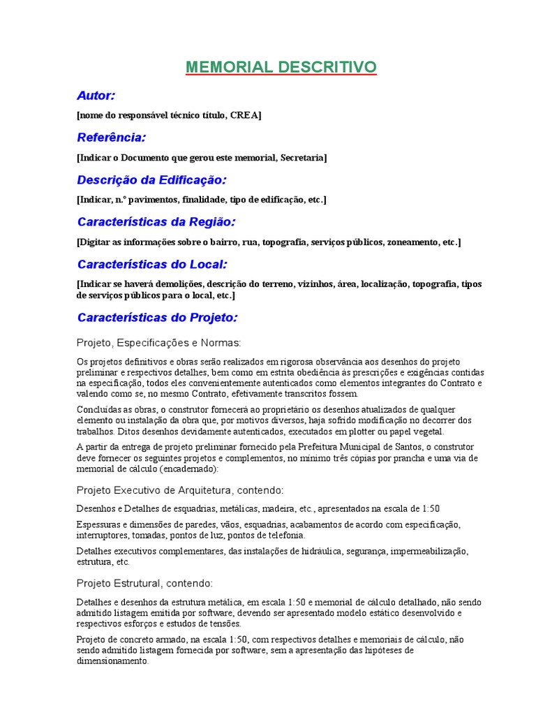 Modelo De Memorial Descritivo Projeto Arquitetonico Docsity