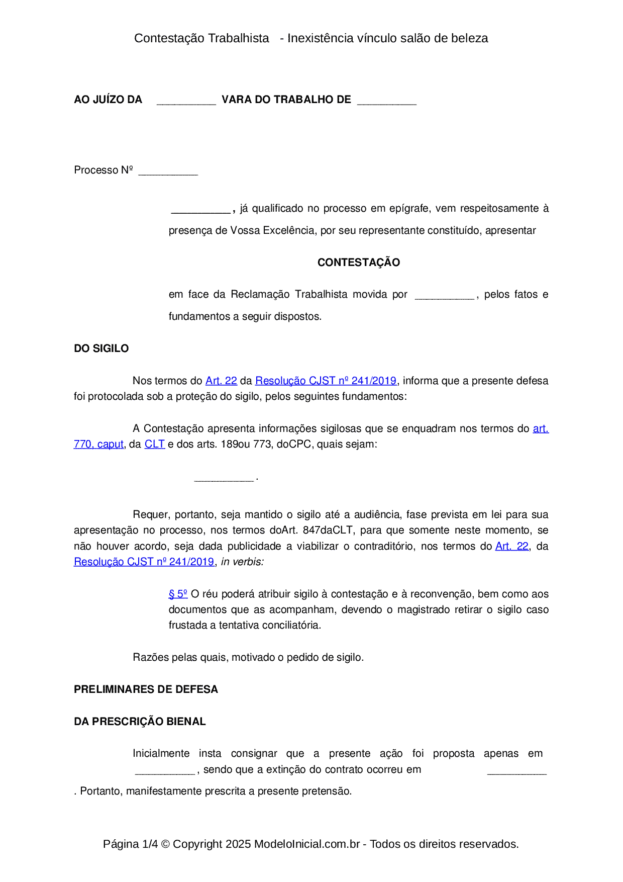 Modelo Contestacao Trabalhista Inexistencia Vinculo Salao De Beleza