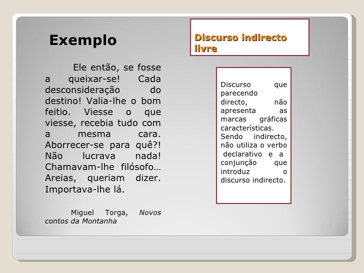 Aqui está a informação completa sobre o que é discurso indireto livre exemplos. O administrador do blog de Novo Exemplo 07 January 2019 também coleta outras imagens relacionadas ao o que é discurso indireto livre exemplos abaixo.