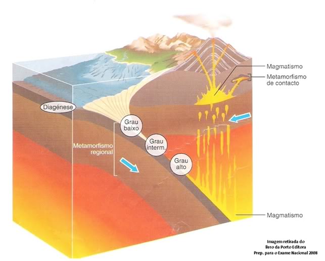 A mudança nas condições de pressão e temperatura provoca mudanças na composição mineralógica da rocha ou pelo menos deformações físicas.