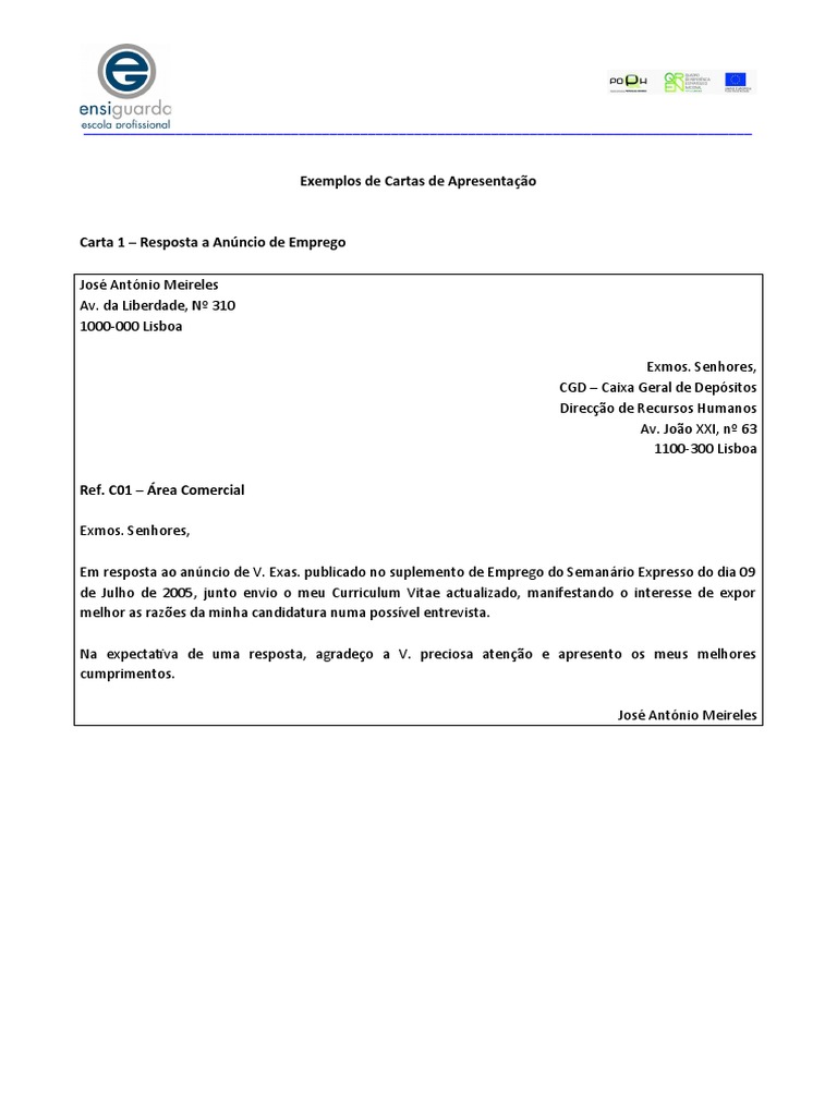 Carta De Apresentacao De Exemplo Para Resposta A Anuncio Para