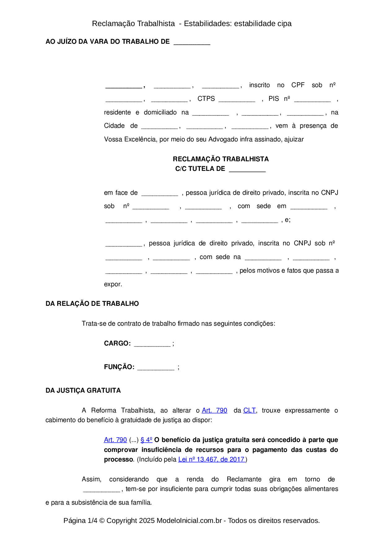 Modelo Reclamacao Trabalhista Estabilidade Cipa