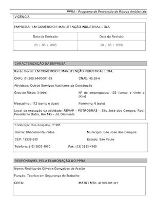 Detalhes de artigos relacionados Exemplo De Ppra De Uma Empresa.