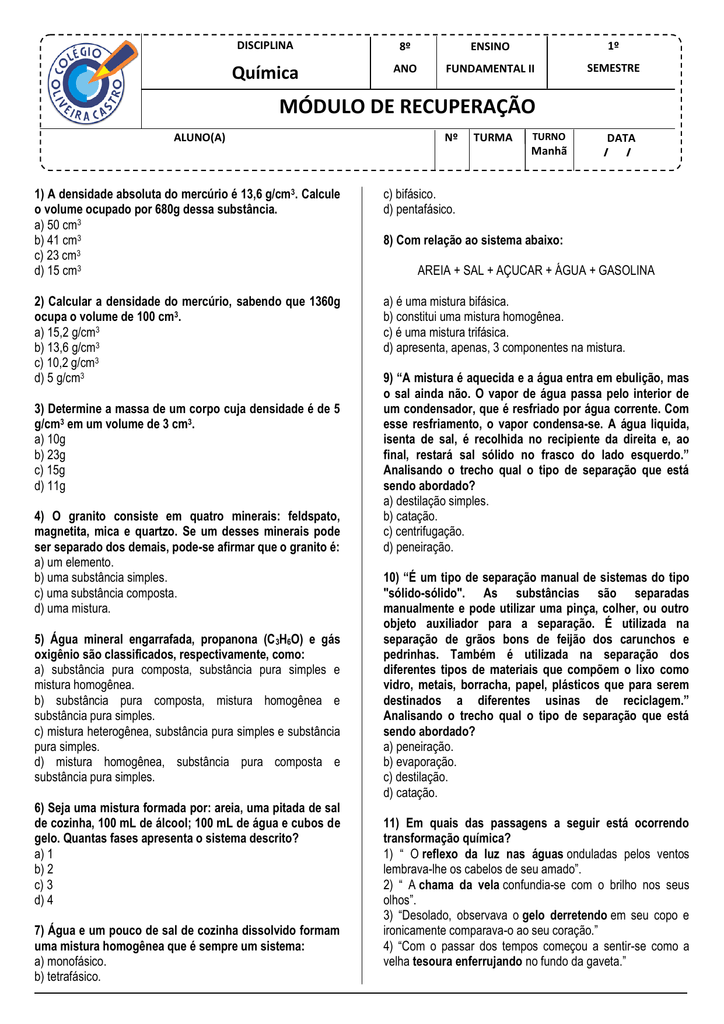 Exercicios Substancias Puras E Misturas 09 1 Ano Substancias