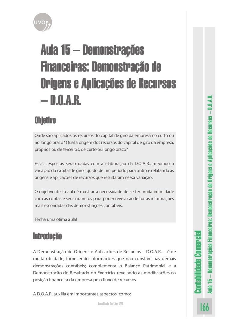 Demonstração das origens e aplicações de recursos doar até 31122007 a demonstração das origens e aplicações de recursos doar era obrigatória para as companhias abertas e para as companhias fechadas com patrimônio líquido na data do balanço patrimonial superior a r 100000000 limite este atualizado pela lei nº 945797.